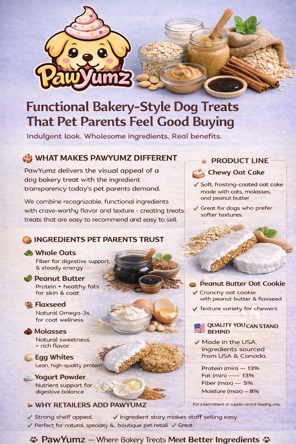 Whole Oats, Peanuts, Molasses, Flaxseed, Cinnamon, Yogurt Powder, Tapioca Maltodextrin, Egg Whites, Sugar, Vegetable Food Colorings. Contains nuts and egg. Guaranteed Analysis: Crude protein (min.) 12%, Crude fat (min.) 13%, Crude fiber (max.) 7%, Moisture (max.) 8%. To be fed as a treat for dogs. Please treat responsibly. Not intended to replace meal. Shelf stable up to 9 months after manufacture date (all orders are made and shipped within 10 days of order). Product does not need to be refrigerated.